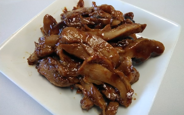 国産モモ肉を醤油ベースのたれで味付け・焼き上げた後、約8mm厚にスライスし、当社独自の照焼きたれに絡めました。